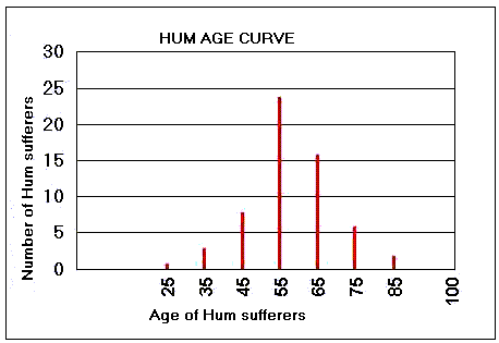 One of the most interesting facts to emerge from a survey of HUM sufferers is a well defined age curve showing that most people begin to hear the HUM around the age of 45 and that the ratio of male to female sufferers is 1/3 male to 2/3 female. Another interesting fact is that some HUM sufferers are either partially or totally deaf.
