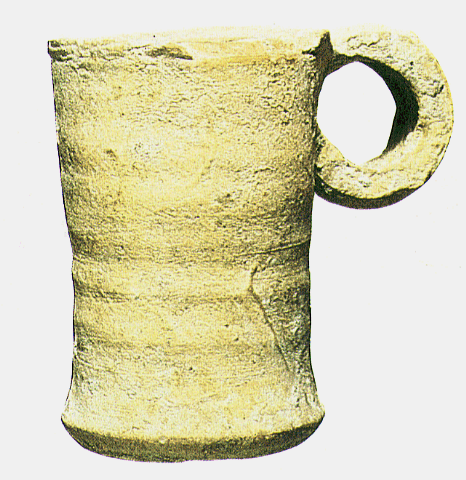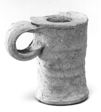 This cylindrical pottery vessel has a flat base and a small, circular, rimmed opening at the top for dipping the pen and topping up the ink. This type of vessel was also found in excavations in Jerusalem.