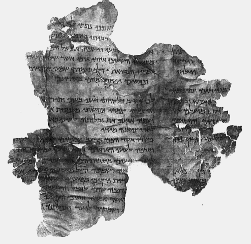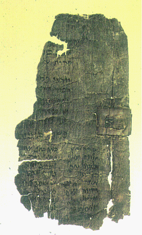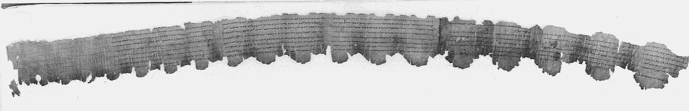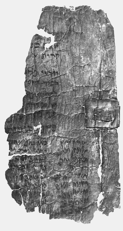 This text is unique in that it can be clearly dated to the rule of King Jonathan. Three columns of script are preserved, one on the top and two below. The upper column (A) and the lower left (C) column are incomplete. The leather is torn along the lower third of the right margin. A tab of untanned leather, 2.9 by 2.9 cm, folds over the right edge above the tear. A leather thong, remains of which were found threaded through the middle of the leather tab on the right edge, probably tied the rolled-up scroll. The form of the tab--probably part of a fastening--seems to indicate that the extant text was at the beginning of the scroll, which was originally longer. Differences between the script of Column A and that of B and C could indicate that this manuscript is not the work of a single scribe.
