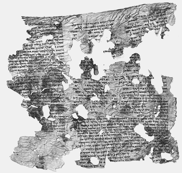 This scroll was discovered in 1956, when a group of Ta`amireh Bedouin happened on Cave 11, but it was first unrolled fourteen years later, at the Israel Museum in Jerusalem. Inscribed in the scroll are parts of the final chapters (22-27) of Leviticus, the third book in the Pentateuch, which expounds laws of sacrifice, atonement, and holiness. This is the lowermost portion (approximately one-fifth of the original height) of the final six columns of the original manuscript. Eighteen small fragments also belong to this scroll. The additional fragments of this manuscript are from preceding chapters: Lev. 4, 10, 11, 13, 14, 16, 18-22.