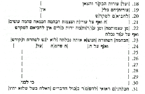 [...before the Priest commanding](1) the Many, and he freely accepted His judgement when He said by the hand (2) of Moses regar[ding] the person who sins inadvertently, ‘let such a one bring (3) [his] sin offering [or] his guilt offering.’ And concerning Israel it is written, ‘I shall ascend (4) to [the Highest in Heaven, and there will not smell the fragrance of their offerings.’ And in another place (5) it is written, ‘return to God with weeping and fasting.’