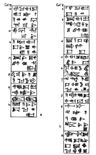 59b Utterly perplexed by the occurrence, Gudea asked for and received permission to seek the advice of the oracle Goddess Nanshe in her "House of Fate-Solving" in another city. Reaching the place by boat and offering prayers and sacrifices so that she would solve the riddle of his nighttime vision, Gudea proceeded to tell her what had happened (we read from column IV in Cylinder "A," verses 14-20, as transcribed by Ira M. Price, The Great Cylinder Inscriptions A and B of Gudea, Fig. 59a):