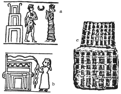 Figures 63a and 63b In some Sumerian cylinder seal depictions a temple-tower (Fig. 64a) is shown no taller than the human and divine personages in the scene, as is the case of a priestess shown decorating a model of a temple (Fig. 64b). It has been assumed that the structures were drawn not to true scale simply to make them fit the space on the seal; but the discovery of actual clay scale models of temples and shriner, (Fig. 64c) - paralleling the biblical references to the Tavnit, suggests that perhaps in Mesopotamia, too, kings were shown actual models of the temples and shrines they were instructed to build.