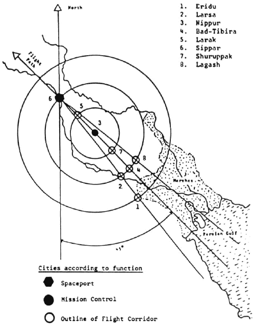 El enigma se resuelve si marcamos estas primeras ciudades establecidas por Enki y Enlil sobre el mapa de la región y las interconectamos con círculos concéntricos. Entonces vemos que, efectivamente, fueron «dispuestas como centros»: todos equidistantes del Centro de Control de Misiones de Nippur. Ciertamente, había un plano «del Cielo Superior», pues sólo podía tener sentido si se observaba todo Oriente Próximo desde las alturas superiores de la Tierra.