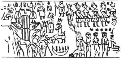 Es una escena grabada en un sello cilíndrico sumerio (Fig. 101) que