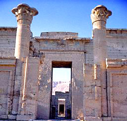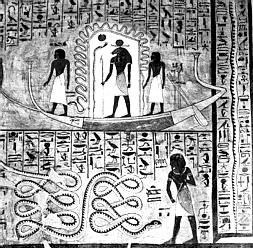 "....The equinoctial orientation of the temple proper and the solstitial one of the corridor, bespeaking the movements of the Sun, led Egyptologists to apply to the structure the term "Sun Temple." They found reinforcement in this designation in the discovery of a "solar boat" (partly carved out of the rock and partly built of dried and painted bricks) buried under the sands just south of the temple enclosure. Hieroglyphic texts dealing with the measurement of time and the calendar in ancient Egypt held that the celestial bodies traversed the skies in boats. Often, the gods or even the deified pharaohs (having joined the gods in the Afterlife) were depicted in such boats, sailing above the firmament of the skies that was held up at the four corner points.