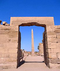 thick, short obelisk-like object. A ramp surmounted by a covered corridor lighted by evenly spaced windows in the ceiling, connected the temple’s elaborate entrance with a monumental gateway in the valley below. The sloping base of the obelisk-like rose some sixty-five feet above the level of the temple’s court; the obelisk, which may have been sheathed with gilded copper, rose another 120 feet.