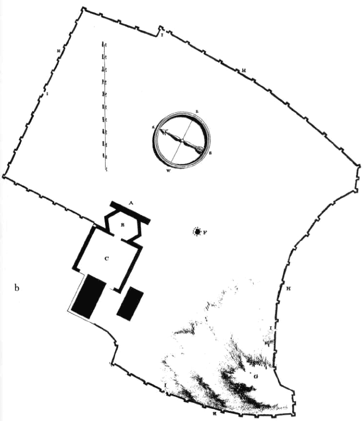 then entered a forecourt ("B") of an hexagonal design, unique in