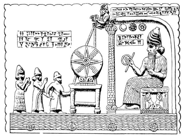 Shamash in Mesopotamia. It shows him seated on a throne, under a