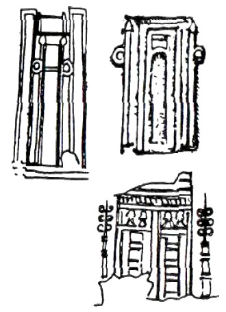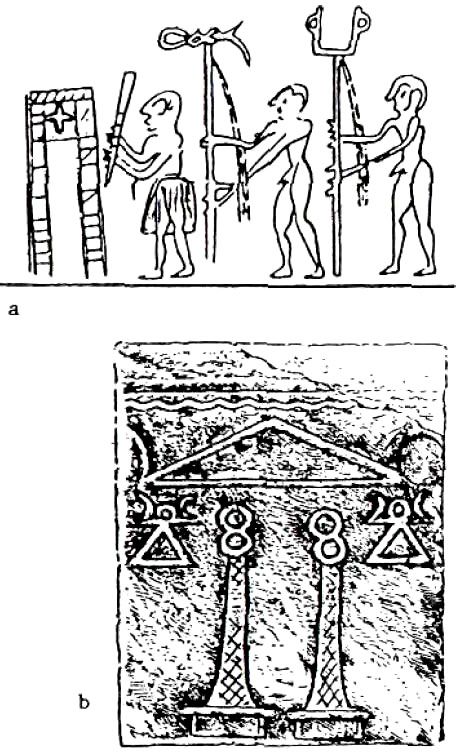 Other depictions of poles-with-rings freestanding, not held up, flanking temple entrances (Fig. 58) suggest that they were the forerunners of the uprights that flanked temples throughout the ancient Near East in ensuing millennia, be it the two columns at Solomon's temple or the Egyptian obelisks. Figure 58