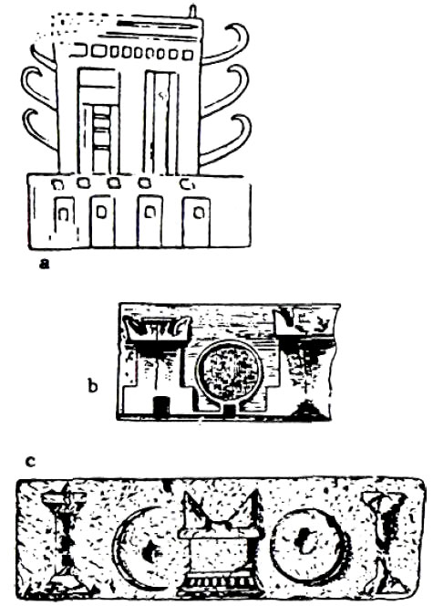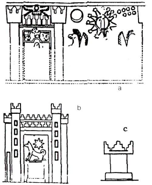 Andrae surmised that some of the depicted altars (usually shown together with a priest performing rites) also served a celestial (i.e., astronomical) purpose. In their serrated superstructures (Fig. 59c) these facilities, high up temple gateways or in the open courtyards of temple precincts, created substitutes for the rising stages of the ziggurats as ziggurats gave way to the more easily built flat-roofed temples.