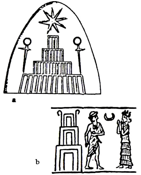 The answer is provided by depictions of ziggurats on whose upper stages poles topped by circular objects are emplaced; their celestial function is indicated by the image of Venus (Fig. 60a) or of the Moon (Fig. 60b). Figures 60a and 60b