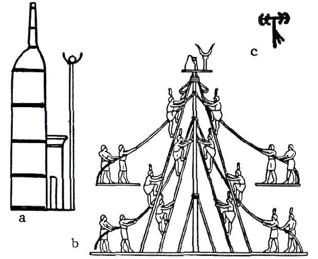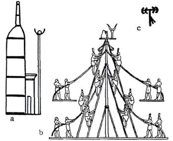 His festival, celebrated once a year at the time of the summer solstice, involved the erection of a high mast by groups of men pulling cords - a predecessor, perhaps, of the Maypole festival in Europe. Atop the mast are raised the emblems of Min - the temple with the viewing lunar horns (Fig. 61b). Figures 61a, 61b, and 61c