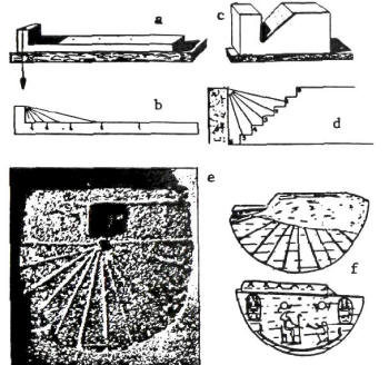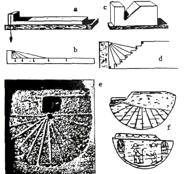 Archaeologists found such devices at Egyptian sites (Fig. 62a) which were pre marked to show time (Fig. 62b). Since at solstice times the shadows grew inconveniently long, the flat devices were improved by inclining the horizontal scale, thereby reducing the shadow's length (Fig. 62c). In time, this led to actual structural shadow clocks which were built as stairways that indicated time as the shadow moved up or down the stairs (Fig. 62d). Figures 62a, 62b, 62c, 62d, 62e and 62f