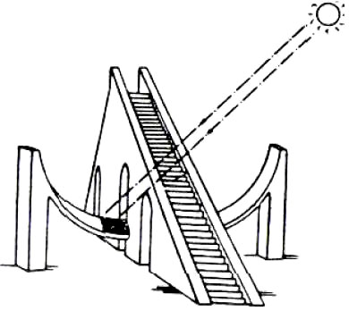 The Hebrew text uses the term Ma'aloth Ahaz, the "stairs" or "degrees" of the King Ahaz. Some scholars interpret the statement as referring to a sundial with an angular scale ("degrees") while others think it was an actual stairway (as in Fig. 62d). Perhaps it was a combination of the two, an early version of the sun clock that still exists in Jaipur, India (Fig. 63).
