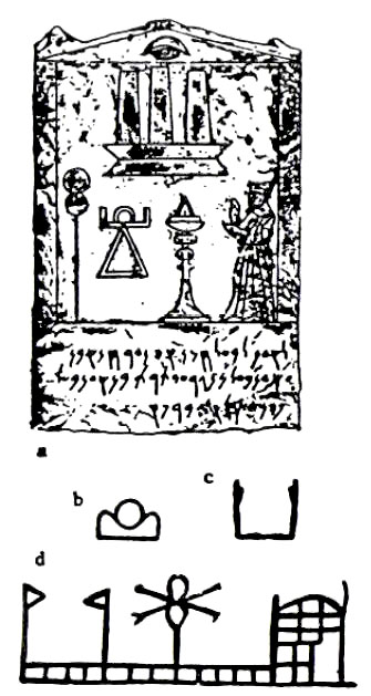 A "votive tablet" found in the ruins of a Phoenician settlement in Sicily (Fig. 66a) depicts a scene in an open courtyard, suggesting that the Sun's movements rather than the night sky are the astronomical objective. The ringed pillar and an attar stand in front of a three-columned structure; there, too, is the viewing device: a ring between two short vertical posts placed on a horizontal bar and mounted atop a triangular base. This particular shape for observations of the Sun brings to mind the Egyptian hieroglyph for "horizon" - the Sun rising between two mountains (Fig. 66b). Figures 66a, 66b, 66c and 66d