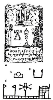 There they adopted as their main divine symbol the depiction of an astronomical instrument; before it began to appear on stelae and even tombstones, it was shown in association with two double-ringed pillars that flanked the entrance to a temple (Fig. 65b) - as earlier in Mesopotamia. The ring flanked by two opposite facing crescents suggests observations of the Sun and of the Moon's phases.