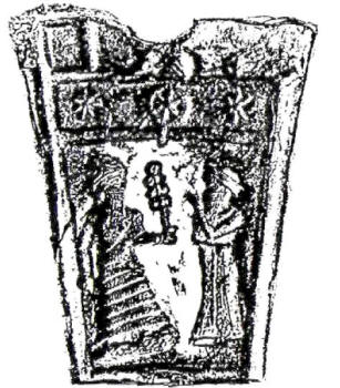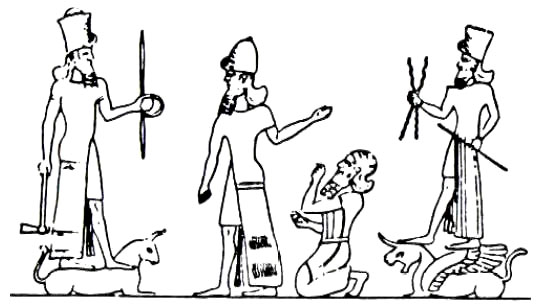 This would be in line with the attributes of Shamash - the God whose celestial counterpart was the Sun and who commanded the spaceport, and of Adad who was the "weather God" of antiquity, the God of storms and rains. Shamash (Utu in Sumerian) was usually depicted (see Fig. 54) holding the measuring rod and cord; Adad (Ishkur in Sumerian) was shown holding the forked lightning.