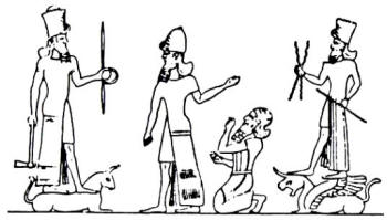 A depiction on the royal seal of an Assyrian king (Tukulti-Ninurta I) shows the king being introduced to the two great Gods, perhaps for the purpose of granting him the knowledge they had once given to Enmeduranki (Fig. 69). Figure 69