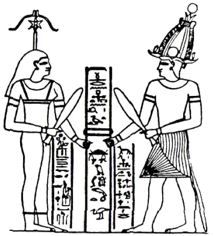 The Egyptian hieroglyph depicting this step-pillar was called Ded, meaning "Everlastingness." It was often shown in pairs, because two such pillars were said to have stood in front of the principal temple to the great Egyptian God Osiris in Abydos. In the Pyramid Texts, in which the pharaohs' afterlife journeys are described, the two Ded pillars are shown flanking the "Door of Heaven."