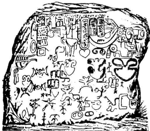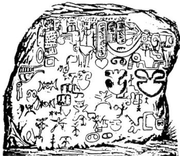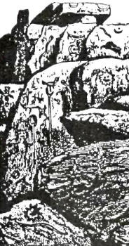 Petroglyphs found near Cajamarca in the north of Peru (Fig. 146) that depict the Sun, the Moon, five-pointed stars, and other celestial symbols, show repeatedly next to them the symbol of the serpent - the unmistakable emblem of Enki and his clan and specifically so of the deity known as the "Plumed Serpent.'' Figure 146
