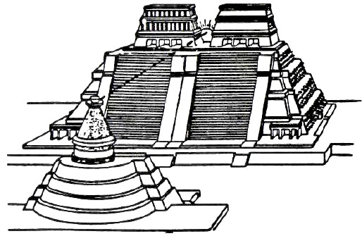Such remains begin with two perfectly round mounds that marked out the astronomical sightline at La Venta, one of the earliest sites of the Olmecs - African followers of Thoth who had arrived in Mexico by crossing the Atlantic circa 2500 BC. At the other extreme of the four millennia that passed from then till the Spanish conquest, the latest instance of observatory-in-the-round was the semicircular pyramid in the sacred precinct of the Aztecs in Tenochtitlan (later Mexico City). It was so positioned that it served to determine the Day of the Equinox by watching, from the round "Tower of Quetzalcoatl," the Sun rise precisely between the opposite Pyramid of the Two Temples (Fig. 149). Figure 149