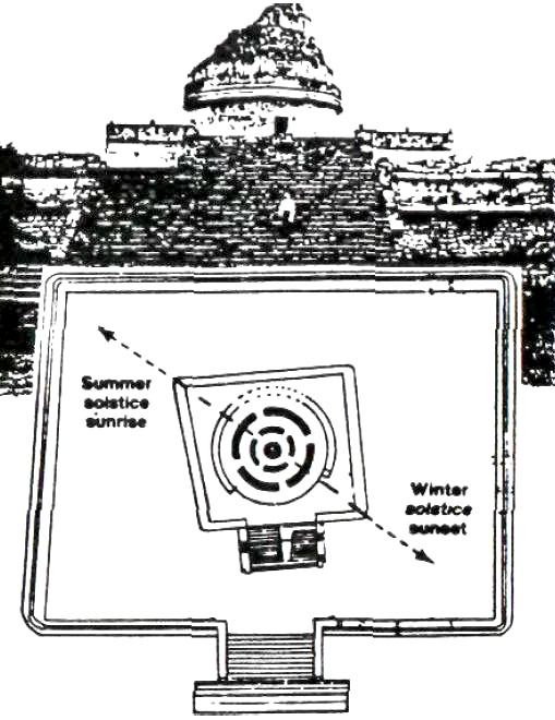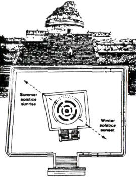 The most renowned of these structures is the Caracol in Chichen Itza in the Yucatan peninsula - a circular observatory (Fig. 151) whose astronomical functions and orientations have been studied extensively and firmly established. Although the presently seen structure is believed to have been built only in AD. 800 or thereabouts, it is known that the Mayas took over Chichen Itza from earlier settlers, erecting Mayan structures where older ones used to be. An original observatory, scholars surmise, must have stood at the site at much earlier times, built-over and rebuilt as was the Mayan custom regarding the pyramids. Figure 151