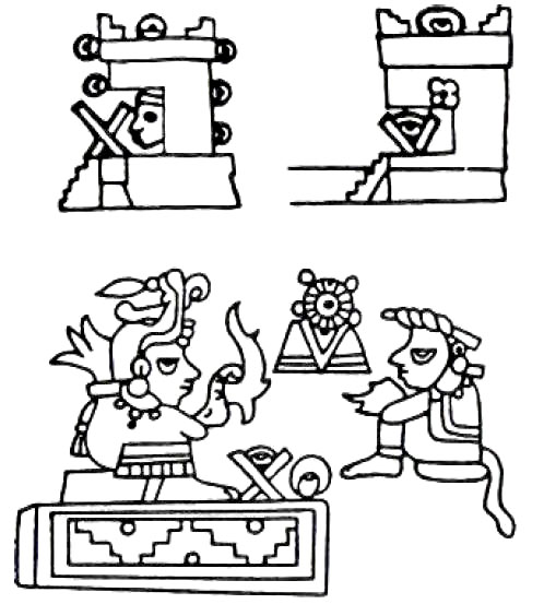 One, in Codex Bodley (bottom of Fig. 152), indicates that the two astronomer-priests are viewing the Sun as it rises between two mountains; that is exactly how the Egyptian hi eroglyphic texts depicted the idea and the word "horizon"; and it may not be by chance alone that the two mountains in the Mayan codex look like the two great pyramids of Giza. The links with the ancient Near East in general, and with Egypt in particular, that are evidenced by glyphs and archaeological remains are augmented by legends.