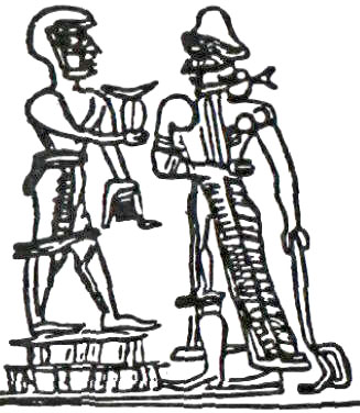 (A Babylonian artist, depicting the encounter between the two brothers, showed Nergal with his identifying weapon, and a helmeted Marduk standing atop his ziggurat and holding in his hand a device - Fig. 153 - that looks very much like the viewing instruments that were employed in Egypt at the temples of Min.)
