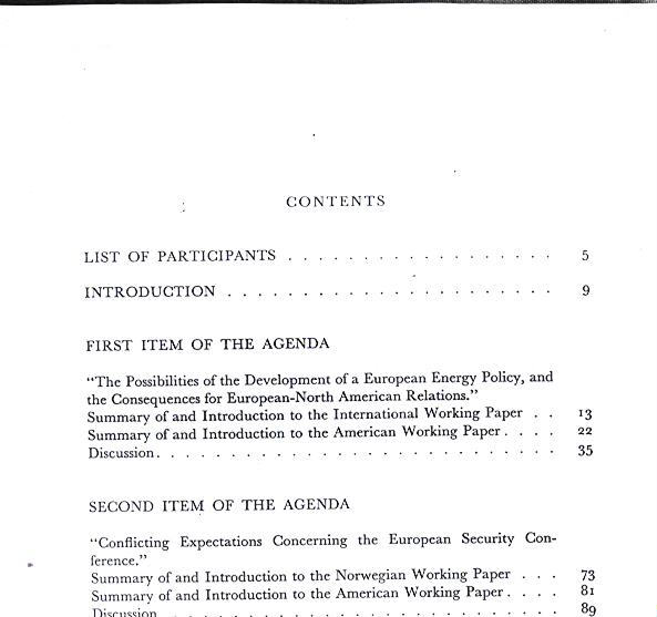 Contents page of the May 1973 Bilderberg Conference minutes.
