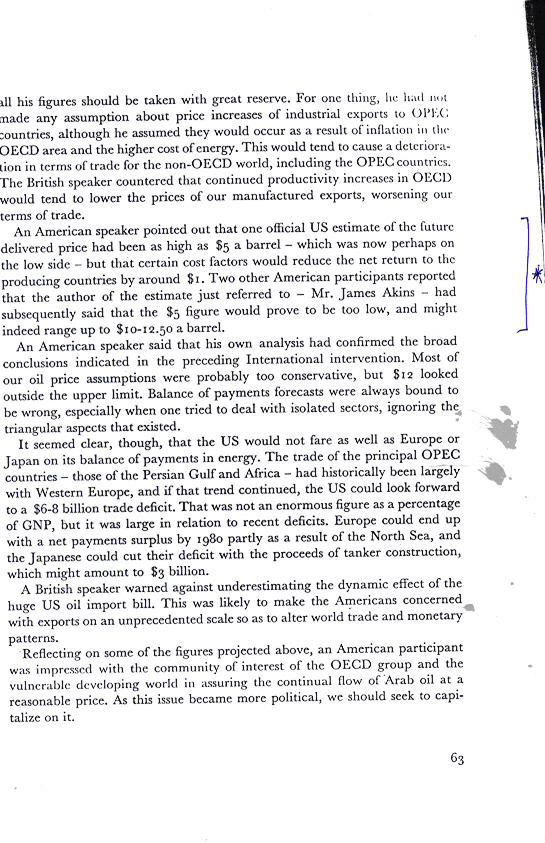 Oil discussion by participants at the May 1973 Bilderberg Conference. Here the price of $10-12.50 a barrel is discussed for the first time. Eight months later on1st January 1974, a second oil price "shock" hit the world and saw the price of crude leap to $11.65 per barrel, following the demand of America's mid-east "puppet" the Shah of Iran. It is quite certain that the Shah would not have forced the price rise without US support. It is believed the Shah was ordered to do so by Dr. Henry Kissinger. |