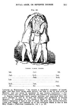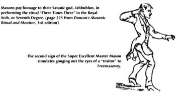 As we shall see, the llluminati worship deity by many names in many disguises. One such name and disguise is "Jahbuhlun." In pursuit of their worship of this false God, Jahbuhlun, they have devised many rituals in which they employ "hidden" hand signs. In all the 33 degrees of Scottish Rite Freemasonry and in the rituals of the York Rite, the Order of Skull and Bones, the Ordo Templi Orientis, the Grand Orient Lodge of France, the Grand Lodge of Jerusalem, and on and on in almost all the secret societies and orders, handsigns, and handshakes are prominent.