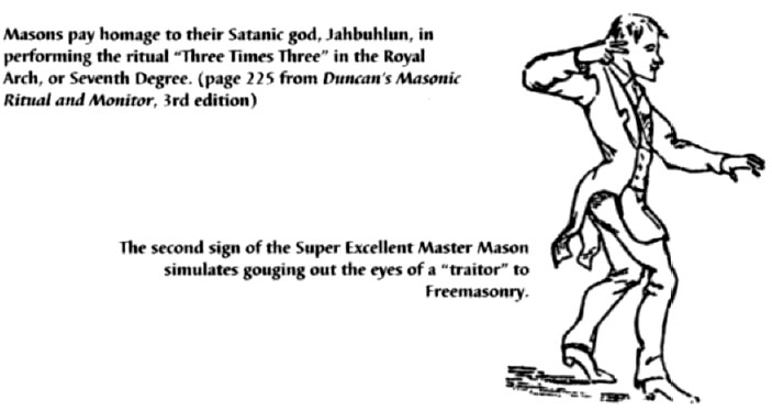 The hand can also be used as a threat to any would-be traitors or betrayer of the Illuminist cause. In the authoritative Richardson's Monitor of Freemasonry we find an example of this in the second sign of the Super Excellent Master Mason. The sign consists of raising the right hand, making the two first fingers like a fork, and simulating the gouging out of the eyes of a "traitor."