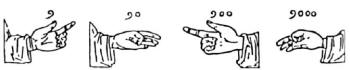 Numerical hand signs from a Renaissance text on mathematics. Such usage often combines the teachings of numerology with the secret messages of hand communications'.