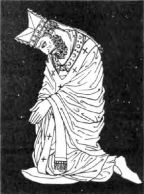 An odd, old drawing of a priest with hands in prayer, but aimed downwards toward Satan!