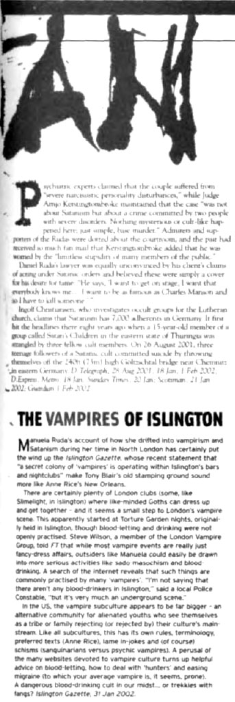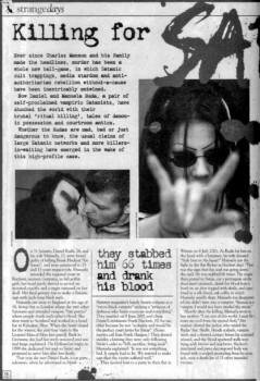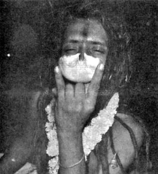 Some might say that Manuela's hand sign is merely the deaf "love you," but the couples' grim conduct indicated otherwise. Also shown: Manuela's head, shaved to reveal an inverted Christian cross. Manuela also had a rough-edged, blood red circle tatooed on her scalp. The two were trained to be Satan worshippers while visiting Scotland. (From news report and article in Strange Times magazine, Great Britain) An American member of the Aghora sect of Hinduism drinks from the top of a human skull. Some members of the sect practice cannibalism to gain magical powers (The Tampa Tribune, June 2, 2003, p. 1).