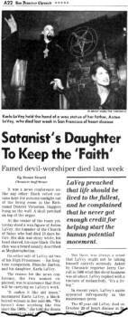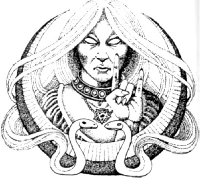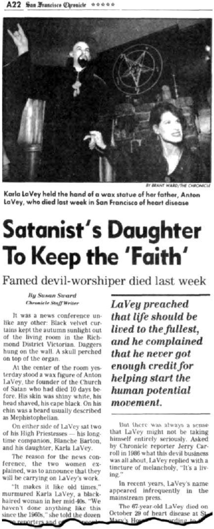 The illustration from the book Witches, by Una Woodruff and Colin Wilson (Crescent Books, New York, 1988), shows a satanic witch signaling the "El Diablo." High priest of the Church of Satan, Anton LaVey, was honored upon his death in this article in the San Francisco Chronicle. In the picture, LaVey is giving the "El Diablo" hand sign while, on the wall, is the "Baphomet" version of the satanic pentagram star.