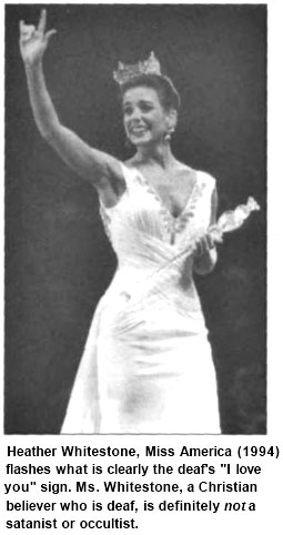 Three versions of the "El Diablo," the sign of Satan, the horned God. The hand sign at right is also the deaf's gesture, or signing, for "I love you," a fact which has many people confused.