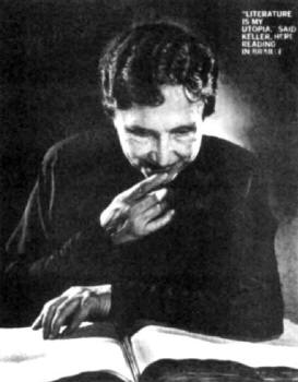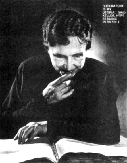 Also, lights displayed in three triangles are in the background. The triangle has three sides. Three plus three equals nine. The number nine in occult numerology conceals the number 666, the number of the beast, since adding the digits 6+6+6=18=9. Whether the cover artist and the author were aware of these oddities is unknown. Helen Keller (1880-1968), shown here at her desk, creator of the deaf signing system. The brilliant Keller was a pitiful character in some ways. Stricken blind and deaf at an early age, she nevertheless went on to considerable achievements in life.