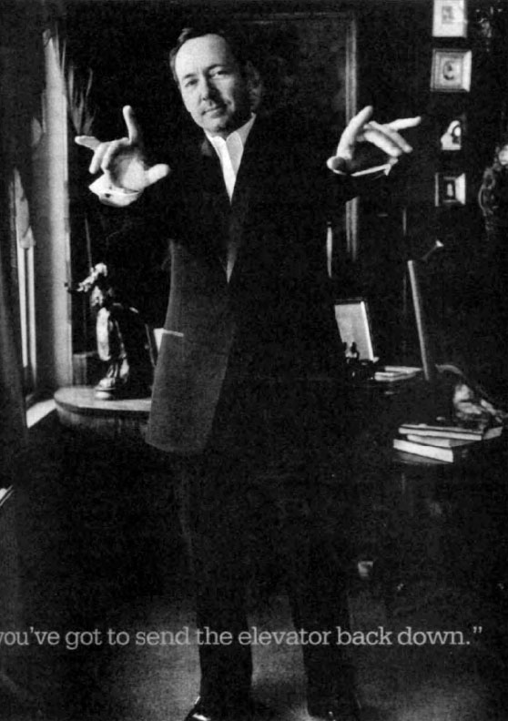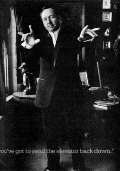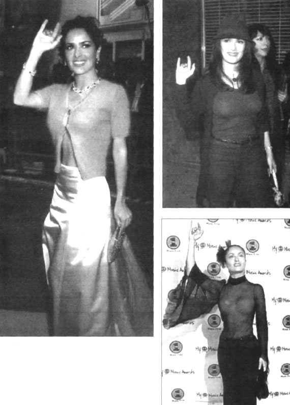 The revealing but quite subtle message below reads: "You've got to send the elevator back down." Actress Salma Hayek giving either the deaf's "I love you" or the horns of the devil sign.