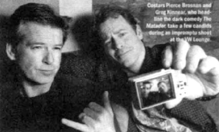 Handsome actor Pierce Brosnan of Great Britain, to left of actor Greg Kinnear, has a rather odd look on his face as he gesticulates with his left hand. (People magazine February 7, 2005)