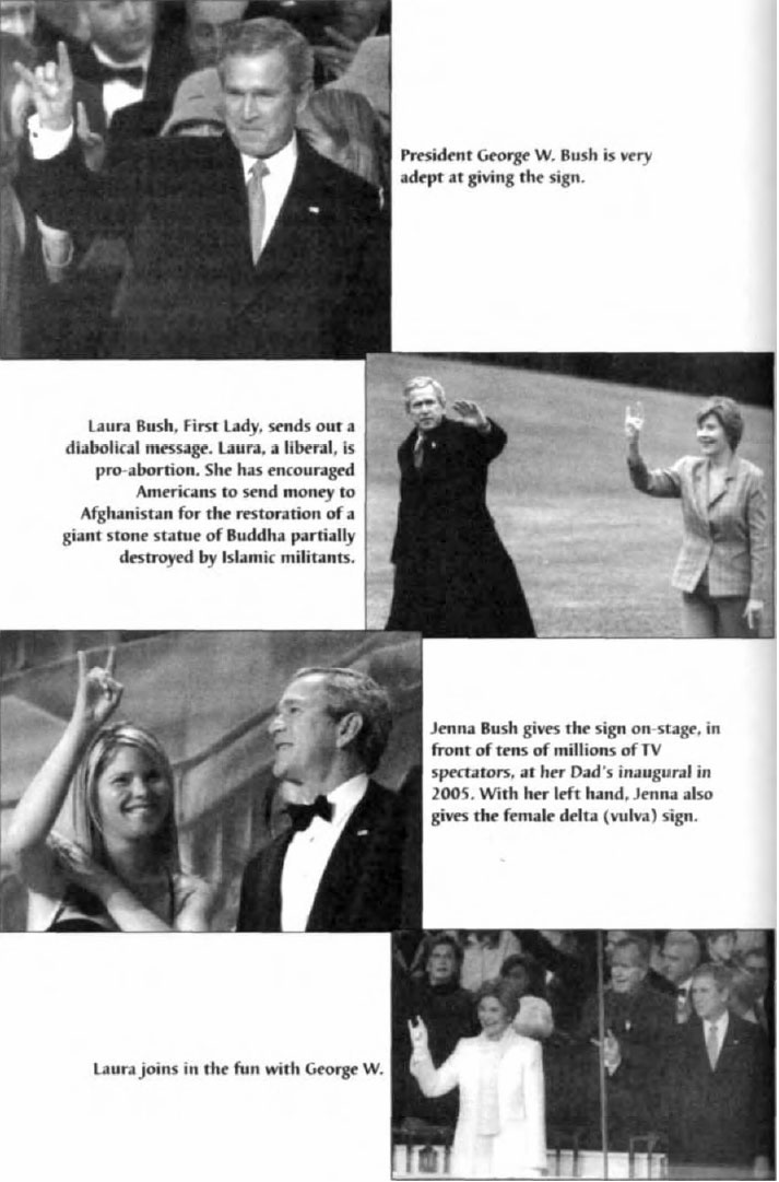 This photograph of President George W. Bush in Time magazine (June 4, 2001) is curious. It shows Bush presenting the horned devil sign. Also, the simultaneous joint use of the circle is evident. Nowhere in the article does the author explain why Bush is making this sign or even explain why he is dressed in what appears to be college robes.