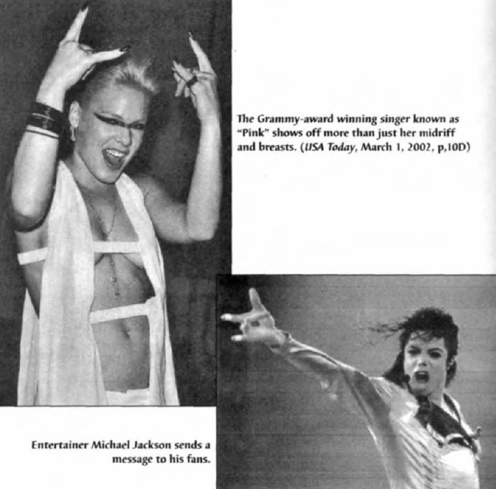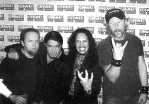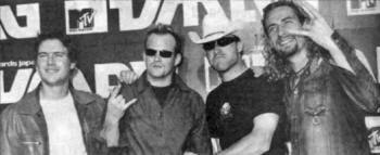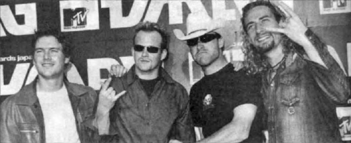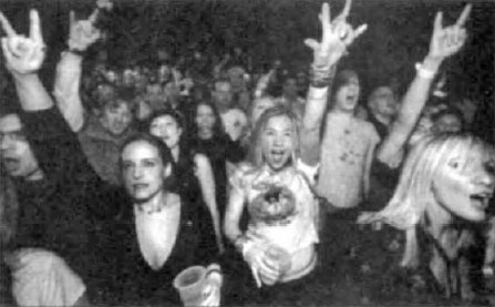 Fittingly, the enthusiastic crowd came to hear the band called Satanicide. Popular singing group Nickelback gives thanks to their hidden deity for their great success. Two are giving the "El Diablo" sign, a third (the one with the hat on) has a skull emblazoned on his T-shirt. (USA Today, June 5, 2002, p. 2A)