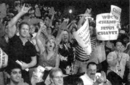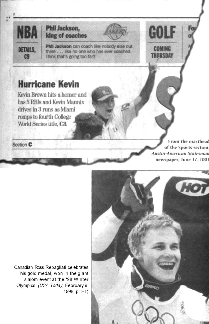 The crowd at a boxing match at Austin Convention Center, Austin, Texas. (Photo: page 1 of Austin American Statesman newspaper, August 16, 2003) Canadian Ross Rebagliati celebrates his gold medal, won in the giant slalom event at the '98 Winter Olympics. (USA Today, February 9, 1998, p. E1) Tour de France champion bicyclist Lance Armstrong gestures heavenward with the index finger of his left hand while, with his right hand, Armstrong seems to be beckoning to a strange God known in the Bible as the "Prince of the power of the air."