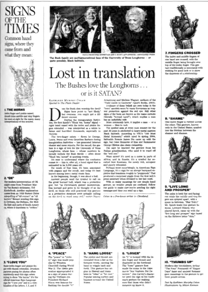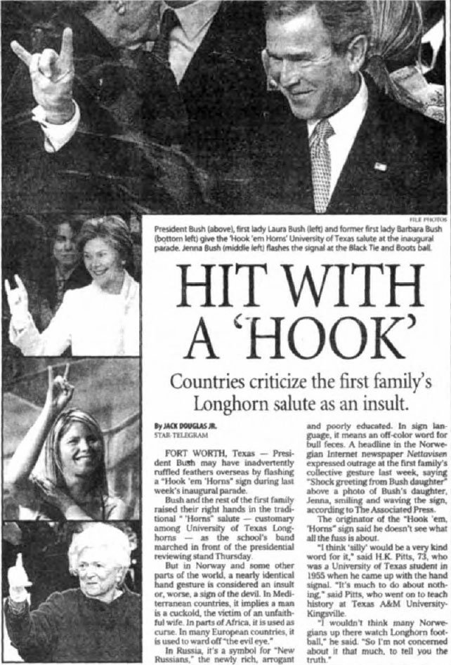 Yes, indeed, there is something funny and strange at work here. This article in the Cleveland Plain Dealer newspaper followed the international controversy of Bush and family giving what appeared to be the devil's hand sign. Yet another article, this one in Fort Worth's Star-Telegram newspaper. The editors insisted that the Bushes were only displaying the "Hook 'em Horns" sign common to University of Texas Longhorns fans. The article points out that in Africa and Europe, the sign is clearly the devil's own. Doesn't it seem odd to you that even Mother Barbara Bush is giving the sign?
