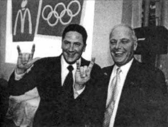 The top two executives of the McDonald's fast food chain jointly display interesting hand signs in this photograph in Newsweek dated February 2004. At left CEO Charlie Bell with his predecessor, Jim Cantalupo.
