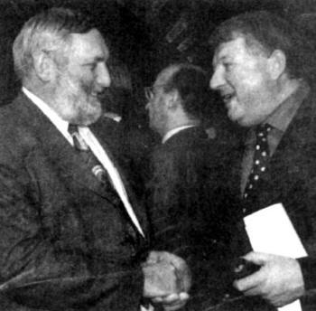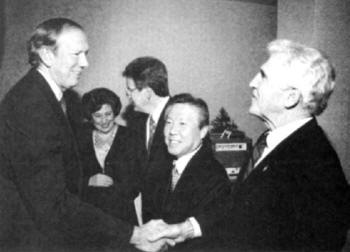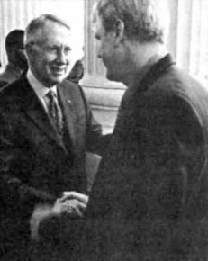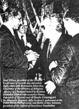 This is called the "cover grip." (Duncan's Masonic Ritual and Monitor, 3d Ed., p. 216) Neal Wilson, president of the General Conference of Seventh-day Adventists (left) exchanges an indisputable (in my opinion) Masonic handshake with Konstantin Kharchev, the Soviet Union's Chairman of the Ministry of Religious Affairs. The occasion was a socialist-sponsored environmental conclave, called the International Forum for a Non-nuclear World and the Survival of Humanity, February 13-15, 1987.