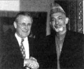 U.S. Secretary of Defense Donald Rumsfeld and Afghani leader Karzai prominently display their Masonic grip. (Newsweek, May 12, 2003, p. 32)
