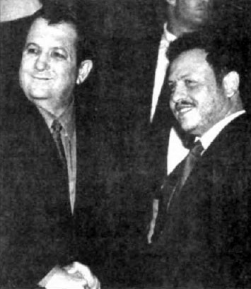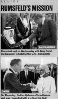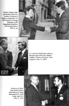 In fact, by this hand grip and by other clear Masonic gestures he has made publicly, it appears that le Pen is a covert Mason, which would make him more akin to Zionism and its Communist Hegelian philosophy. Secretary of State Donald Rumsfeld in the Bush Administration gives coded handshake to Saudi Arabia's King Fahd (top) and Oman's Sultan Qaboos (below). (Time magazine, October 15, 2001)