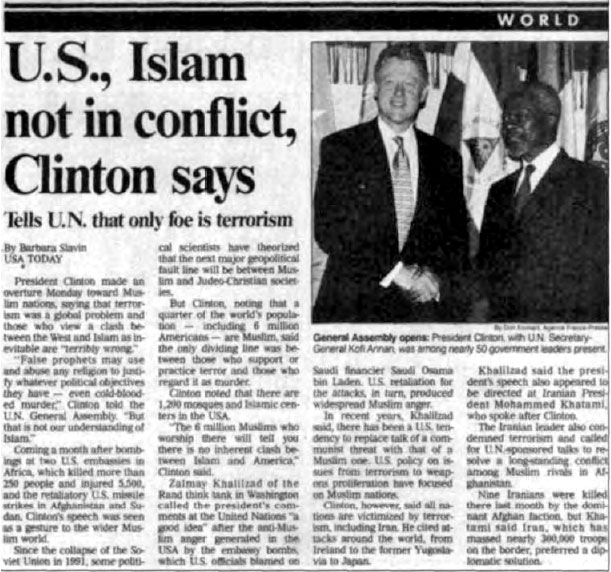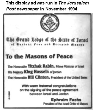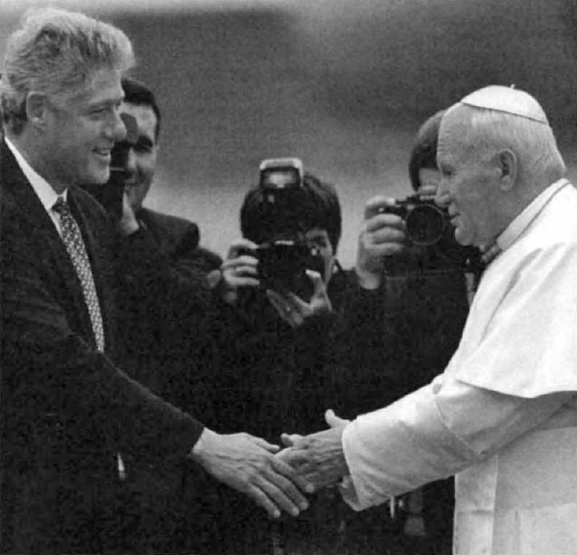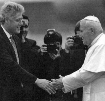 The group is a leader in working to stop prayer in schools, remove the Ten Commandments from public display, and prevent public displays or mention of Christmas. Egyptian Ambassador to Israel Mohammed Bassiouny (center) and his wife with Israel Prime Minister Shimon Peres. As is the practice of the members of both the Grand Lodge of Jerusalem and the Masonic Lodges of Cairo and Egypt, the left hand is used to conceal the Masonic nature of the grip. (Photo: The Jerusalem Post and International Edition, November 1, 1997, p. 9) President Bill Clinton meets in 1995 with Pope John Paul II. The Pope is extending his left hand in a Talmudic attempt to conceal the Masonic grip that is about to occur. Dr. Dennis Cuddy, premier researcher of the global conspiracy and expert on occult symbols, writes: